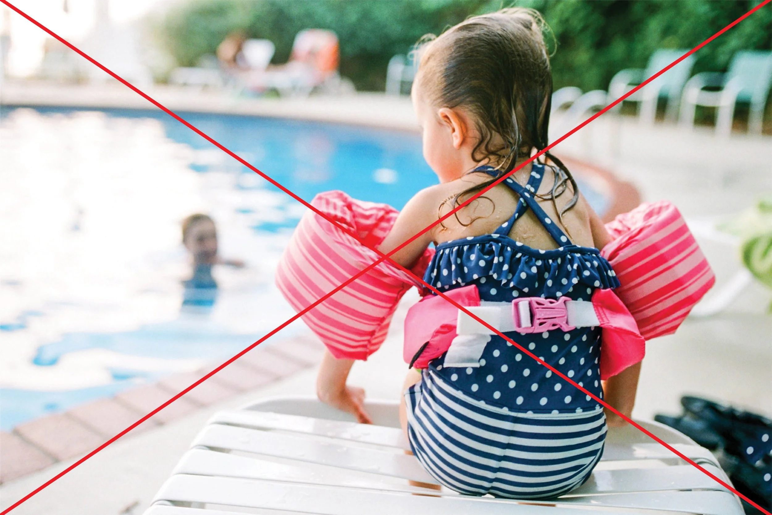 Using life jackets and puddle jumpers in a pool can give a child a false sense of security and teach their body the vertical drowning position.